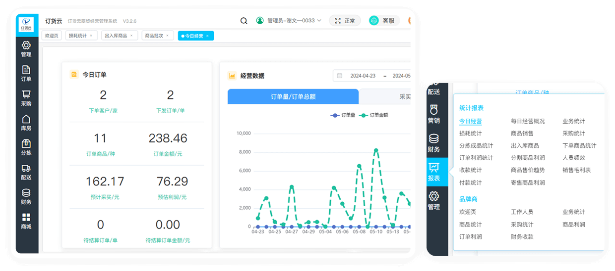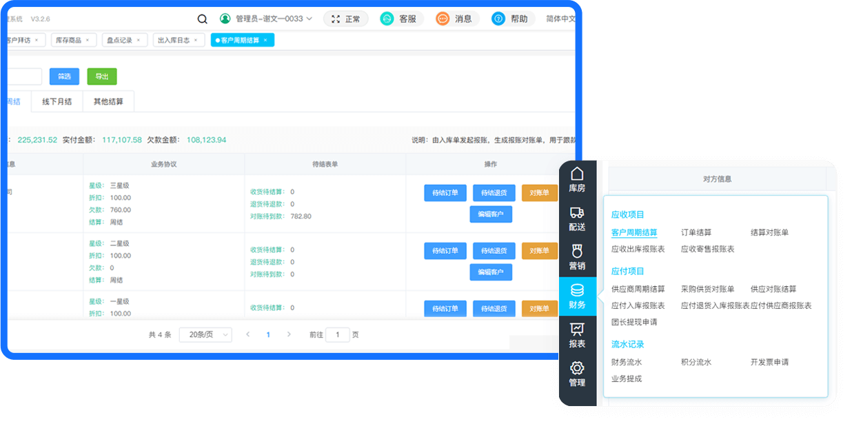 客户结算、供应商结算、采购报账;应收款应付款、销售日报周报月报、采购流水等自动生成,方便财务查账。账款清晰,日结、月结、周期结,账期自动提醒。按天、品类、客户多维度生成毛利报表,方便分析数据,有助于更好的经营!